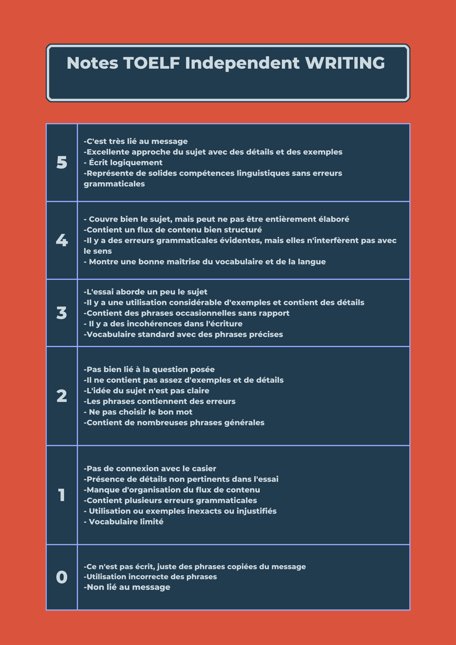Le système de notation TOEFL Writing utilise un système de mesure de 1 à 30. 24-30 est avancé, 17-23 est intermédiaire supérieur, 13-16 est intermédiaire inférieur, 7-12 est basique et 0-6 est inférieur au basique. Cependant, cette partie de l'examen, étant divisée en 2 parties, est utilisée de 2 façons lorsqu'il s'agit de catégoriser les réponses.